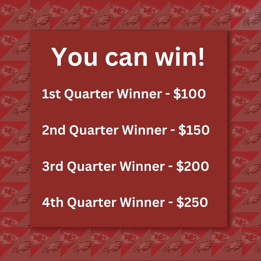 For instance, at the end of the first quarter, if the score is Chiefs – 14, Eagles – 10, then the winner would be the person who had the square where the Chiefs had a 4 in their column and the Eagles had a 0 in their row.
